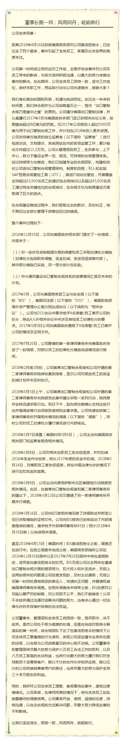 另据媒体报道,中兴通讯董事长殷一民发了封内部信,首次公布事件全过程。