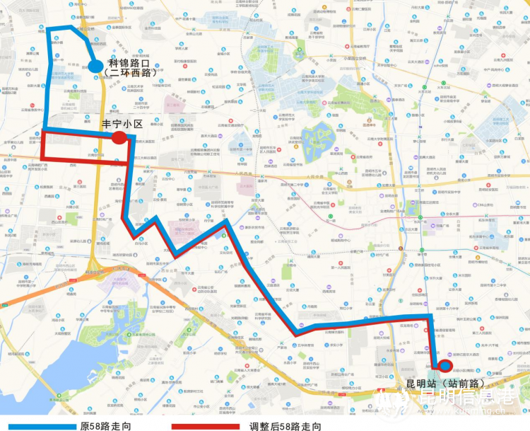 调整后,58路起终站为“昆明站(站前路)(始发站)——丰宁小区(终到站)(终到站)”,可无缝接驳换乘地铁3号线西苑地铁站。途经站点为“昆明站(站前路)(起始站)、双龙商场、双龙桥、华昌路口(环城南路)、滇池路口(环城西路)、气象路口(环城西路)、西坝路口(环城西路)、新闻路口(环城西路)、920医院(去)、丹霞路口(西园路)(去)、环西桥(环城西路)(回)、丹霞路(回)、西园路口(丹霞路)(回)、白马2(去)、白马1(回)、华夏中专(近华浦路)、春苑小区2(去)、春苑小区1(回)、人民西路口(近华浦路)、茭菱路口(近华浦路)、近华浦路口(人民西路)(去)、西苑立交桥(去)、西一中(去)、茭菱路西口(去)、鑫园小区(去)、丰宁小区(终到站)”。