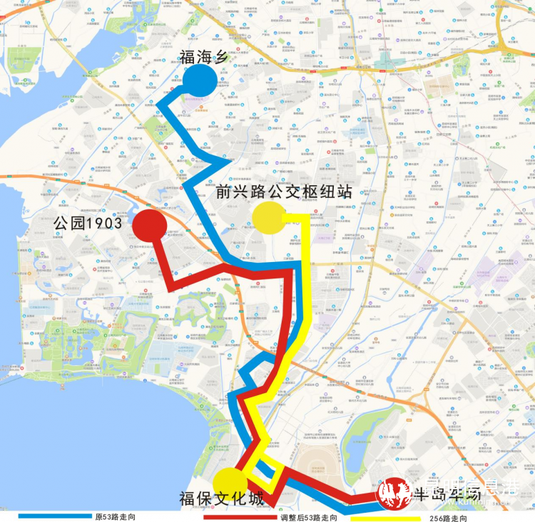 53路整合后起终站由原“半岛车场(起始站)——福海乡(终到站)”调整为“半岛车场(起始站)——海雅路口(海宏路)(终到站)”,可满足公园1903、福保片区、金湖路等片区沿线乘客往返地铁5号线的公交地铁换乘需求。原53路广福路——陆家路——日新中路——滇池路沿线乘客可通过选乘24路、78路、K15路、120路、112路、166路、171路、K52路等公交线路满足出行需求,前兴路、福保片区原256路乘客可选择乘坐K28路出行。