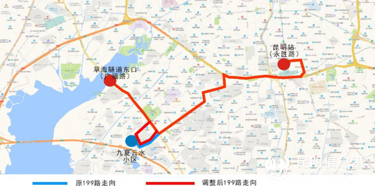 199路原起终站为“昆明站(永胜路)(始发站)——九夏云水小区(终到站)”。滇池东岸(草海)绿道建成后,前往打卡及休闲徒步的市民、游客数量日益增长,现结合市民建议,将199路终到站延长至“草海隧道东口(广福路)”公交站。