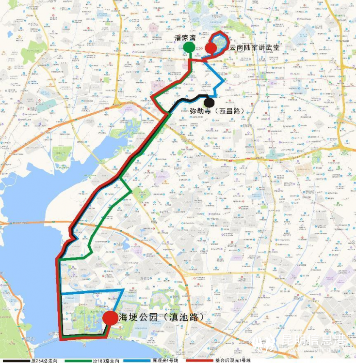 观1路整合后起终站为“海埂公园(滇池路)(起始站)——云南陆军讲武堂(终到站)”,途经站点为“海埂公园(滇池路)(起始站)、海埂公园北门、海埂旅游索道站1、观景路、观景路中段(去)、海埂大坝车场、闸口路口(观景路)(去)、新河村、新河村口、边防路口(西福路)、陆家村(西福路)、郑家河村、平桥村(昆明市地方海事局)1、加州枫景小区、马家堆、西华园(西福路)、东陆桥(西园路)、新闻路口(西园路)、920医院、环西桥(大观路)、篆塘(大观路)、篆塘(昆医附一院)(去)、潘家湾地铁站(小西门)、翠湖南路(去)、翠湖东门(去)、云南大学(翠湖北路)(去)、云南陆军讲武堂(终到站)”。