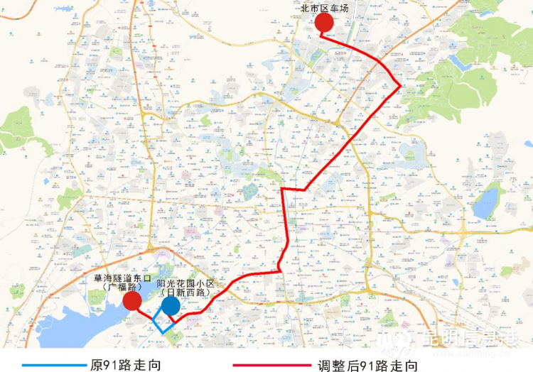 91路调整后营运时间、票制票价不变,途经站点为“北市区车场3(起始站)、月牙塘小区2、霖雨路、霖雨桥(霖雨路)(回)、霖雨桥东2、江东花城、铂金大道、煤机新村、省精神病医院、波罗村、北辰大道路口(穿金路)、穿金路(财大附中)、小坝立交桥、小坝(穿金路)、穿金路中段、席子营社区、席子营(穿金路)、穿心鼓楼(穿金路)、青年路2、小花园(青年路)(回)、德韩口腔金鹰院区(青年路)、得胜桥(青年路)、巡津街、双龙桥、华昌路口(环城南路)、严家地(滇池路)(去)、严家地(环城南路)(回)、金牛小区、老年活动中心、福海乡1、正和小区(回)、滇池路口(日新西路)(去)、阳光花园小区(日新西路)、加州枫景小区(去)、平桥村(昆明市地方海事局)2(回)、草海隧道东口(广福路)(终到站)”。