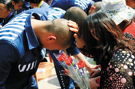 《烛光里的妈妈》演唱完毕后,100名重刑犯迎来了期盼已久的环节,为母亲洗脚。昨日上午,昆明监狱举行“2014年开放日暨母亲节亲情帮教活动”,300名远道而来的家属走进监狱探望亲人。能在母亲节这天为年事已高的母亲送去感谢,不少服刑人员情绪难抑,和家人在跪抱在一起。