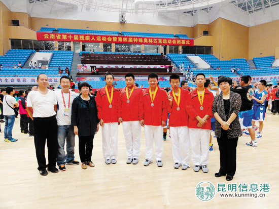 在云南省第十届残运会上,代建荣(左一)带领新萌学校篮球队夺得了第二名 供图