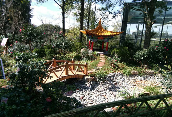 楚雄百泽园艺公司布置的“百泽春晓”得到了专家们的青睐,获得了特金奖。“百泽春晓”采用中国传统园林布景手法布置,中间是精心打造的百泽亭,周围种植了100多种山茶花,营造出小桥流水、曲水流觞,春意盎然之景。