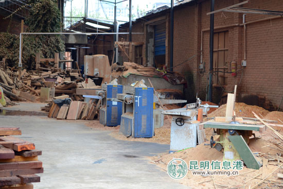木料加工厂里杂乱的堆放着各种木料 实习记者张昊哲/摄