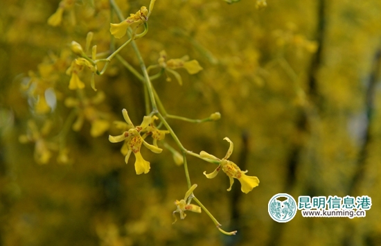 金殿名胜区兰花馆内,5种来自中南美洲的珍奇兰花,包括文心兰、紫香兰、米尔特兰、彗星兰、树兰。其中最为明艳动人又奇特的要数文心兰。文心兰花为明黄色,花朵轻盈小巧、一簇簇开起来像一群金色蜜蜂,煞是可爱,来参观的市民争先恐后与最大的一盆文心兰合影。小盆栽的文心兰更是成为手机和相机的焦点。云南大学经济学院教授程士国介绍,文心兰作为鲜切花上市是全国首次,填补了兰花做鲜切花的空白,丰富了兰花品种。目前,一株3A级(植株高度为90厘米以上)的文心兰的售价为最低5元。一盆盆栽文心兰,若维护管养得当,其花期可持续2到3个月。