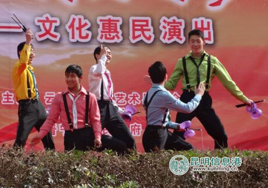 之后,由40余位著名文艺家组成的云南省文联文艺家志愿者服务团精心准备的节目陆续上演。其中包括:云南省花灯表演艺术家、中国戏剧梅花奖得主李丹瑜的花灯演唱《耍山调》、《小河淌水》、青年歌唱家鲁林独唱《滇国故乡情》……而成都军区战旗杂技团表演的杂技《高车踢碗》更是让观众连连叫绝。