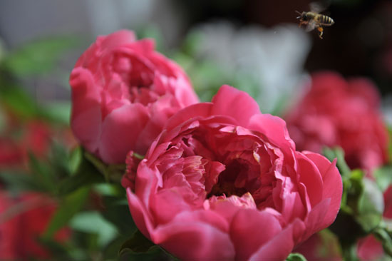 雍容华贵的牡丹盛开引来蜜蜂无数。 昆明日报 记者杨艳辉/摄