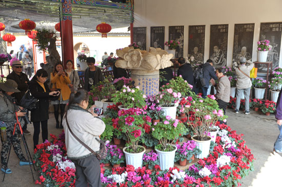 除了单独观赏牡丹,整个前园的布置也让人心旷神怡,牡丹花在上层作为主体,下有各色仙客来和黄色报春映衬,中间穿插着描写牡丹的诗词,配合园林造景,营造出浓厚的文化氛围。昙华寺园林工程师李永发介绍,今年牡丹花展,为了给市民打造一场全新的花海盛宴,昙华寺在前园、中园和后院分别精心布置了“三阳开泰”“春日第一花”“牡丹仙子”“国色天香”“画牡丹”“琼台花容”6组园林小品。