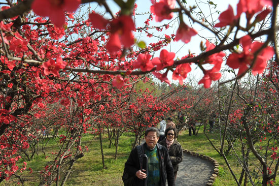在昙华寺木瓜花园,200余株贴梗海棠正开得正好,灿若红霞,一片片红色将高大的瑞应塔掩映其中,形成了一副中国山水画。市民纷纷到花园拍照留念,有市民赞叹:“贴梗海棠的红色,是真正的中国红!”贴梗海棠即酸木瓜花,属于蔷薇科木瓜属灌木,花色艳红,花瓣倒卵形,许多市民把贴梗海棠误认为是梅花,其实贴梗海棠浑身是刺,树枝繁复,与梅花的差别很大。