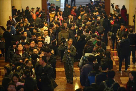 3月1日,北京,全国政协十二届三次会议内地记者情况通报会在全国政协礼堂举行。会后,记者排起长龙领取采访证件。据介绍,今年参与大会报道的境内与境外记者总数达3100多人。