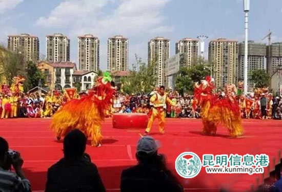 下午13:30,整个广场龙腾狮跃、锣鼓喧天,一条条金色的巨龙和花哨硕大的狮子,在铿锵锣鼓声中上下游走,欢腾跳跃,此起彼伏的锣鼓声和经久不息的掌声,又增添了节日的喜庆氛围。 官渡区龙狮队身着艳丽服饰,舞着精心制作的龙狮,在威风锣鼓声中,舞出了技艺,亮出了绝活,在巨龙上下飞舞中,阵阵掌声此起彼伏。
