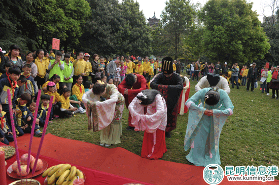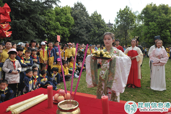 昆明信息港讯 记者杨雁 以往的春游活动,是同学们组织到某地后,便在一起嬉笑、打闹、玩耍。但3月27日在昙华寺公园举办的春游活动却颇有新意,上千名同学在踏青玩耍的同时,观摩了一场由云南汉服协会现场呈现的春祭典礼,表演人员通过诵读国学经典、举行春祭仪式,进一步在广大学子中弘扬国学文化,展示出传统文化的魅力。