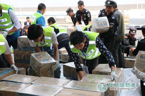 据悉,昆明机场接到救灾飞行保障信息后,第一时间调配人力、物力,迅速落实救援客机运行保障工作。昆明机场运行指挥中心及时部署相关要求,由于此次救灾运输的货物较多,早上8时30分,空港物流的工作人员提前4个小时就开始对“医疗急救用品、器械、帐篷、发电设备、饮用水、压缩饼干”等救灾物资的安检、验收、组装、配载和运输工作,确保首架救灾客机能在最短时间内装载完成。11时55分,国航059运输客机抵达昆明机场停机坪,13时10分,救灾物资全部装载完成,昆明机场各保障单位通力配合,14时17分,救灾客机起飞前往尼泊尔震区。