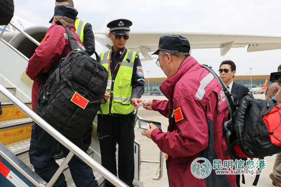 中午12时49分,云南省医疗专家队伍抵达昆明机场。昆明机场安检站提前抽调了10余名业务骨干组成了专项保障小组,开设国际10号专用通道,按照保障要求,组织部署人员为前往加德满都的医疗急救队进行检查、放行。为保证医疗专家及所携带“氧气瓶、救援工具和生活用品”等物资安全、快捷过检,安检专项保障小组提前为救援专家们宣贯过检注意事项,并及时与航空公司沟通协调,对物资清单进行查验核实,开设绿色通道,保障救援专家队伍、携带物品快速通过安检登机。