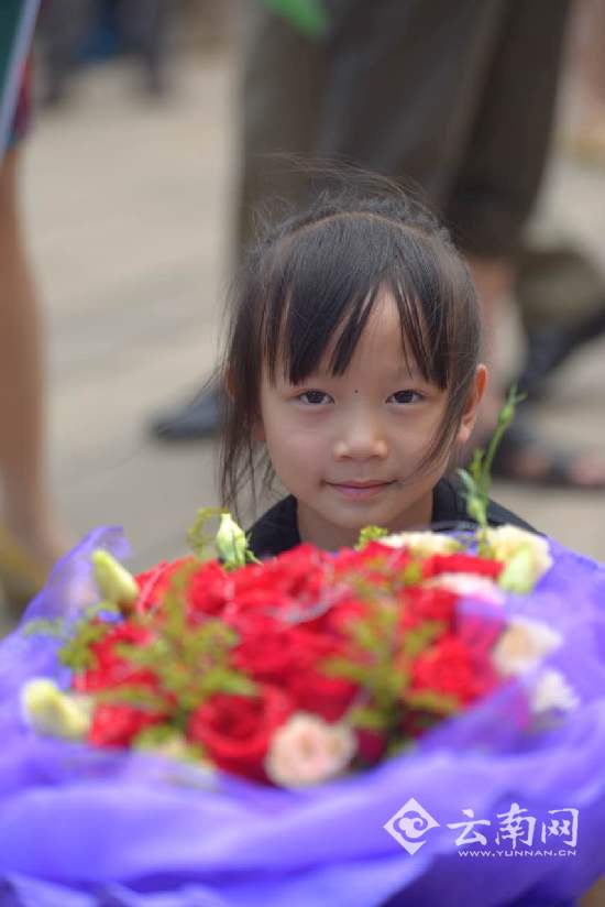 下午数学考试即将结束时,记者在云大附中考点外看到一位小女孩抱着一束几乎与她身高齐平的鲜花。