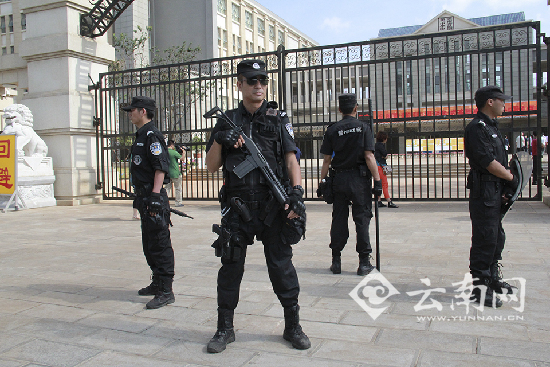 昆一中考点门口,五华区公安局治安大队反恐应急巡逻中队的李逸人和其他3名同事在大太阳下值守着,防暴枪、手枪、警用匕首、催泪瓦斯……李逸人告诉记者,身上的装备重达25公斤。