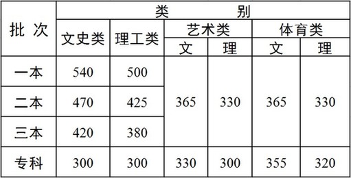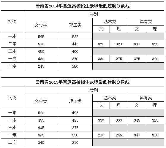 昆明信息港讯 云南省2015年普通高校招生录取最低控制分数线在云南省招考频道网站上公布,其中一本最低分数线文史类540分,理工类500分;二本文史类470分,理工类425分;三本文史类420分,理工类380分。艺术类和体育类本科三批次最低分数线均为文科365分、理科330分。专科批次文史类300分,理工类300分,艺术类文科330分、理科300分,体育类文科355分、理科320分。