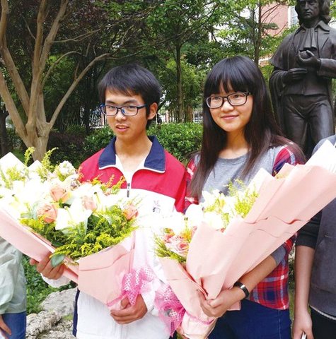 云南高考理科头名刘德斌(左)、文科头名朱俊瑞(右)合影。记者 杨映波/摄