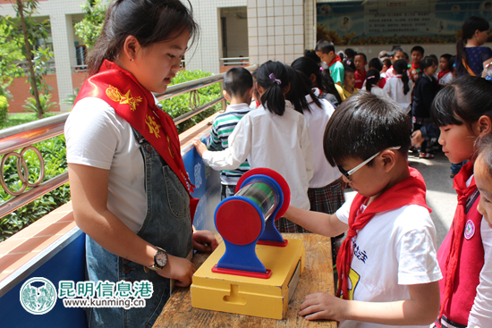 昆明信息港讯 记者栗飞 通讯员熊楠 张云洪 用手搓就能喷出水珠的鱼洗,会吃钱的魔术盒子,必须开动脑筋才能解开的锁…… 近日,云南省青少年科技活动中心的工作人员们带着25件涉及声、光、电、磁、力学等方面的科普展品以及有趣的益智玩具 ,来到官渡区云溪小学开展“科普使者”进校园活动,让孩子们现场体验互动。