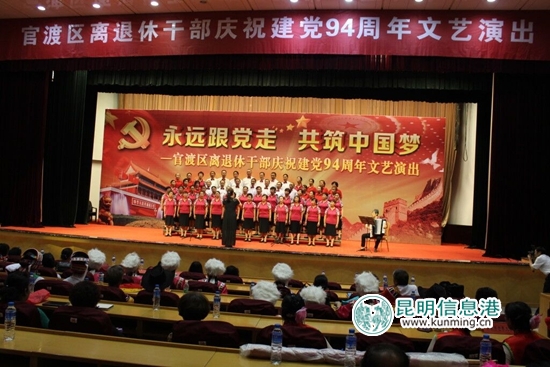 昆明信息港讯 记者栗飞 通讯员郭武辉 7月3日,官渡大酒店的会议厅里宾客满座,歌声嘹亮、舞姿飞扬。由老年朋友们带来的一出出精彩表演轮番上演,以欢乐祥和的活动氛围庆祝建党94周年。