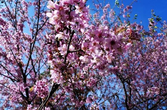 冬樱花,又名云南早樱,日本夏季的应景花,原产于中国,广泛分布于云南地区,花期11月份左右。花瓣约25枚,花径2.5厘米左右,花呈半开状态,下垂,萼片红色。