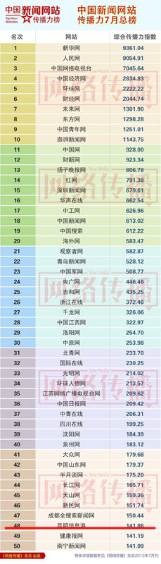 近日,中国新闻网站传播力七月榜单新鲜出炉,昆明信息港综合传播力跃居中国新闻网站第48位,居全国地方城市网站第10位(其中,昆港微 信传播力居全国第6位,微博传播力居全国第22位),系云南唯一进全国50强榜单的网站。