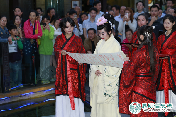 昆明信息港讯 记者赵艳芳 “纤云弄巧,飞星传恨,银汉迢迢暗渡……”提起秦观的这首词,许多人都会想到七夕牛郎织女相会的场景。昨日,第八届昆明市七夕文化节在翠湖如期举行,200多名身着华丽汉服的俊男美女与来往的市民游客共度佳节,再现传统文化。