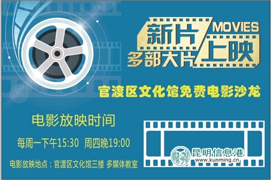 为丰富广大社区群众的文化生活,满足群众的文化需求,官渡区文化馆在“文化惠民”送电影下乡工作的基础上,将持续开展免费电影沙龙活动,观影时间暂定于每周一下午15:30和周四晚上19:00,放映地点为官渡区文化馆三楼多媒体教室,广大社区群众和外来务工人员皆可到官渡区文化馆畅享观影之乐。
