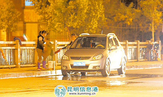 当晚9:40,记者来到江岸小区盘龙江边,只见岸边放着6大桶水,水桶边站着一个吆喝洗车的人,旁边担着毛巾、洗衣粉等工具。只要有汽车路过,这人就吆喝起来:“来洗车啦,10块、10块!”