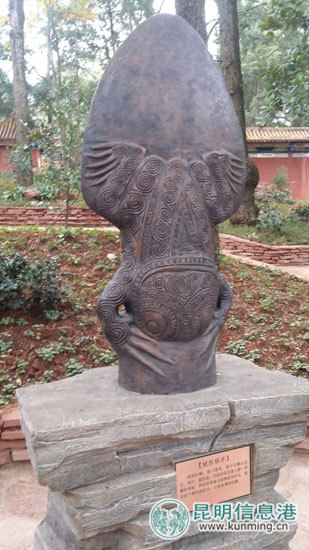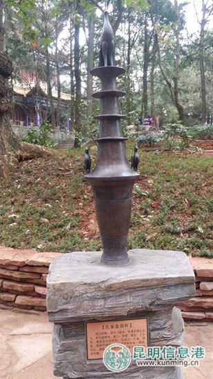 金殿名胜区,因大殿用黄铜铸成,阳光照耀下光芒四射,因此得名,名声显赫的金殿是中国四大铜殿之一。为提升金殿名胜区内的青铜文化特色景观,今年,公园对其青铜文化景廊进行了提升,以在云南出土的6组文物为原型,放大若干倍后打造成青铜文化雕塑。其中为衔接钟楼与茶花园,在此区域新建了4组青铜雕塑,包括“蛙形铜矛”、“孔雀盖铜杯”等,“蛙形铜矛”的原物目前收藏于云南省博物馆、“孔雀盖铜杯”收藏于云南省文物考古研究所,这两件雕塑的原件出土于战国、西汉时期。此外,为衔接茶花园和钟楼,在园内的“鸣凤晨钟”石牌坊下的楼梯两旁,新建了孔雀浮雕长廊,楼梯最下方的扶手采用铜鼓为设计原形,最上方则是孔雀为设计原形,楼梯两侧长达10米的中间扶手部分采用青铜浮雕进行设计。在整个青铜文化景廊区还增植了云南山茶、滇丁香、玉兰等植物,营造良好的景观,也为市民、游客的游览增添了新的亮点。
