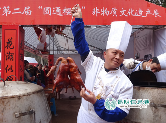 现场还有呈贡豌豆粉、官渡饵块、宜良烤鸭等美食可以品尝。开展首日,作为非遗美食项目的宜良烤鸭免费提供给市民品尝,香味浓郁,引得游客垂涎欲滴,排起了长长的队伍,第一锅刚出炉的12只烤鸭不到3分钟便被一抢而空。据掌握宜良烤鸭整套制作工序的周锡跃说:“宜良烤鸭对于老昆明人来说是一种记忆,一种熟悉的味道,因此很受欢迎。宜良烤鸭将持续展示展销至3月8日。”另一个非遗美食项目官渡饵块也受到市民热捧,排起了大长队。据杨勇介绍,他们每天准备400多个饵块,今天早上不到两小时就卖了60多个饵块。