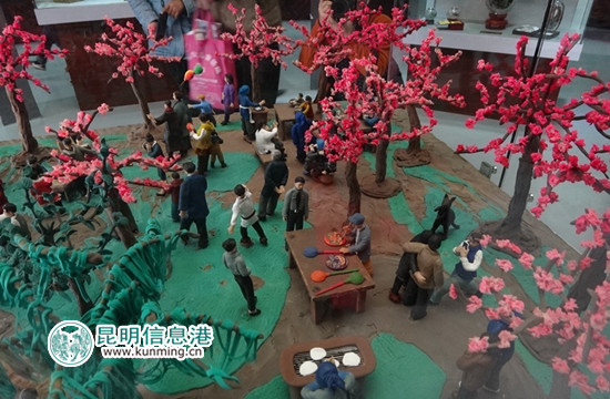 为迎本届樱花节,昆明动物园提升打造了全新的非物质文化遗产作品展示馆。在位于樱花区的八角亭内,摆放着本届非物质文化遗产展中琳琅满目的精品,有云南斑铜、乌铜走银、宜良木雕、云南围棋制作、云南滇派内画、禄劝彝族服饰、撒尼刺绣、五华葫芦雕绘、天宝斋制墨、盘龙剪纸、小窑村瓦猫、宜良白陶瓦兽、苗族铸银等市级非遗项目的优秀作品。其中,一组用面塑展示“圆通樱潮”盛景的作品引得游客纷纷驻足欣赏、拍照留念。据了解,面塑主要是用上等的小麦面粉和糯米面,配以各种颜色和石蜡、蜂蜜,经过防裂防霉处理,和成柔软面团,运用捏、搓、揉、掀、切、科、划、挑等技法,最终制成作品。