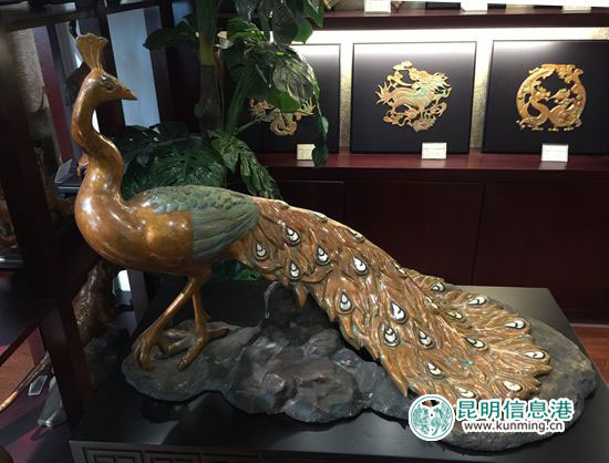 再说到云南的斑铜,云南斑铜制作技艺起源于青铜器时代,历史悠久工艺精良,在我国金属制造工艺中,具有较大的历史文化价值与鲜明的地方代表性和民间艺术色彩。此次在动物园内展出的斑铜作品——《金孔雀》,包含了斑铜工艺、铜绿工艺、乌铜走银工艺三种技艺特点,造型优美、色彩绚丽,既代表着祝福吉祥的文化意义,又展示了云南金属制作技艺的最高水平。