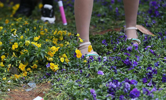 眼里只有樱花和海棠,却忽视了脚下的花坛里还有别的时令鲜花,为拍樱花,许多游客踩出现踏花坪行为。这真是“爱上一种花,弄死了它花”。是否真爱花,还得打个问号。