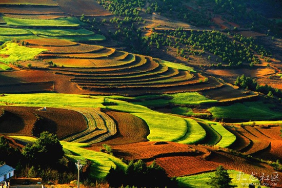 第二天,站在三黑山瞭望塔,远处大片大片的梯田状的红土地尽收眼底。说是红土地,其实颜色不仅仅只有红,翠绿的燕麦,泛黄的沙土一起,看上去就像五彩的调色盘,煞是好看。网友飘逸表示,比起东川,联合乡的红土地中有几处村落,充满意境,她更喜欢这种有灵气的感觉。