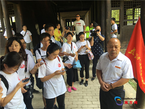 湖南站的媒体记者倾听工作人员讲解红军历史。(南方网罗俊杰 摄)