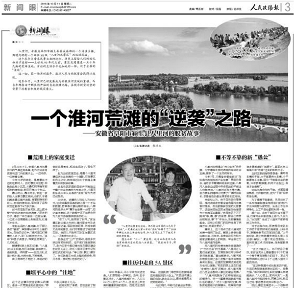 今年7月,为筹备安徽省政协“加快淮河流域旅游产业发展”界别协商会,省政协专题调研组来到这里,八里河人在创业过程中所体现出的干劲让人印象深刻。“八里河这种不等不靠、自力更生的精神太可贵了!”调研组组长、安徽省政协副主席李修松这样说。