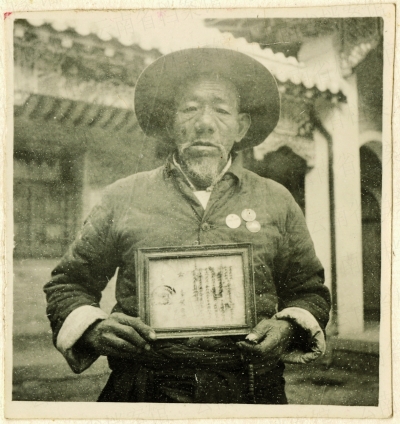 归化寺喇嘛夏拿古瓦手执贺龙所颁发的委任令。