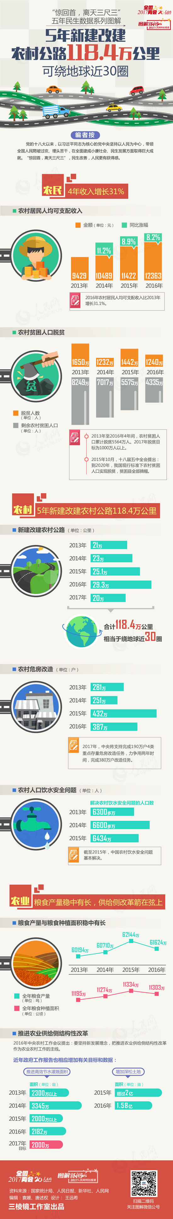 这是一组对农村发展非常关键的数据。2013年年底,交通运输部部长杨传堂表示,当年我国新建改建农村公路21万公里。政府工作报告则表明,2014年新建改建农村公路23万公里;2015年,达25.1万公里。2016年,达29.3万公里。2017年,还将新建改建农村公路20万公里。如果2017年目标顺利实现,5年间,我国新建改建农村公路总里程数将达到118.4万公里,相当于绕地球近30圈!