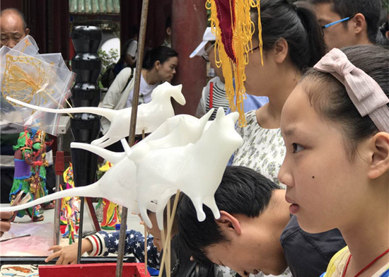现场,糖画、捏面人、水晶花制作、金属丝编制、皮影、米上刻字等传统手工技艺也进行了集中展示。