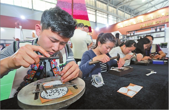 从富民小水井农民合唱团的天籁之音、乌铜走银的精湛传统技艺,到“全民造物”时尚手工、别致的鲜花美食;从VR/AR互动体验,到人与机器人的交流互动……在创意云南2017文博会昆明馆里,一项项“文化+”融合成果的创意和精彩,让人应接不暇的同时,也让昆明变得更加灵动智慧、生机勃勃。