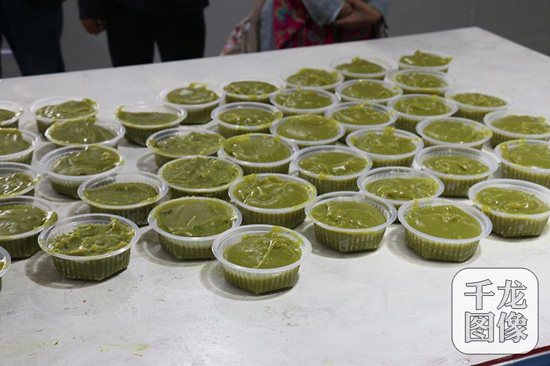 “朋必”的成品看上去有些像北京的豌豆黄,不过口感可大不相同,咸中带香,配上特制的辣椒酱,更是别有一番风味。