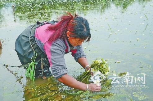 “家家种海菜花,生态环保,经济价值高。”在右所镇松曲村,正在摘海菜花的村民杨玉兰介绍,海菜花种植在村中已形成“气候”,她家种了两亩,每月可摘3次,有2000多元的收入。种一年可以采摘五六年。