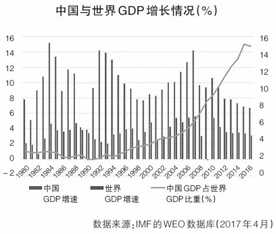 中国为世界经济增长贡献分三个阶段(见图)。有限贡献阶段(1978年—1997年),这一阶段中国对世界经济增长贡献总体来说不是特别大,中国GDP占世界GDP比重基本稳定在3%上下,这个阶段中国主要通过高投入激发经济活力,以换取高增长。稳定贡献阶段(1998年—2008年),经过1997年亚洲金融危机的洗礼,这一阶段中国开始展现出强劲的发展实力,中国GDP占世界GDP比重稳步上升,从1998年的3.3%上升至2008年的7.2%。巨大贡献阶段(2009年至今),2008年国际金融危机席卷全球,中国虽受到波及,但仍保持经济增长的韧劲。在这一阶段,中国对世界经济增长的贡献达到了前所未有的高度。尤其是党的十八大以来,中国对世界经济增长的年均贡献率达到30.2%,同期美国贡献了增长的17.8%,欧元区贡献了5.3%,日本贡献了3.8%——中国超过美国、欧元区和日本贡献的总和,跃居全球第一。