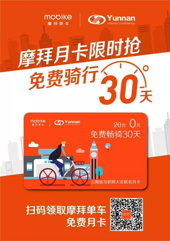 另外,2017第三届云南省互联网大会也给提倡绿色环保、低碳出行的生活理念的您带来了福利,大会特与摩拜单车合作,与会期间为大家提供便捷的出行方式,并为大家放送50000份免费摩拜30天月卡,掀起节能环保风尚。