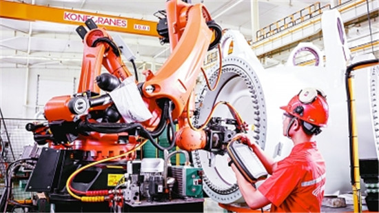 工人在新疆金风科技股份有限公司哈密总装智能生产线上进行数控操作。新华社发