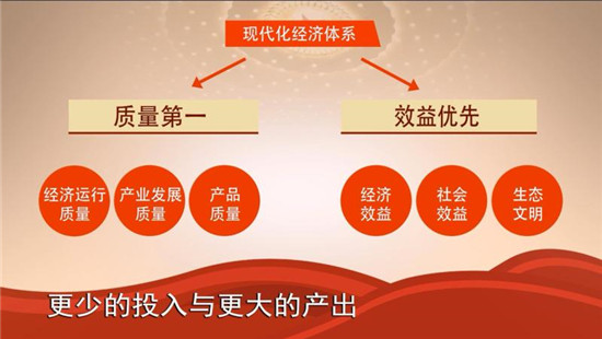 那么,这种现代化经济体系的内涵是什么呢?第一,要坚持质量第一,效益优先。这个“质量”既包括经济运行的质量、产业发展的质量,也包括产品的质量的提高;效益优先,就是要以更少的投入获得更大的产出,既讲经济效益,也要讲社会效益,还要讲生态文明等方面的效益。