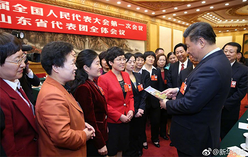 3月8日上午,习近平参加山东代表团审议。习近平代表党中央,向妇女代表、委员及全国各族各界妇女同胞,致以节日的祝贺和诚挚的祝福。
